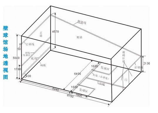 一、 場地標準(國際標準競賽場地) 寬6.4米,長9.75米,前高4.57米,后高2.13米,天花高度5~6米,響板高度0.48米,正面發(fā)球線高度1.83米,地面發(fā)球線距后墻4.26米,半場線將地面發(fā)球線與后墻從中心向左右平分,發(fā)球區(qū)為1.6米見方。